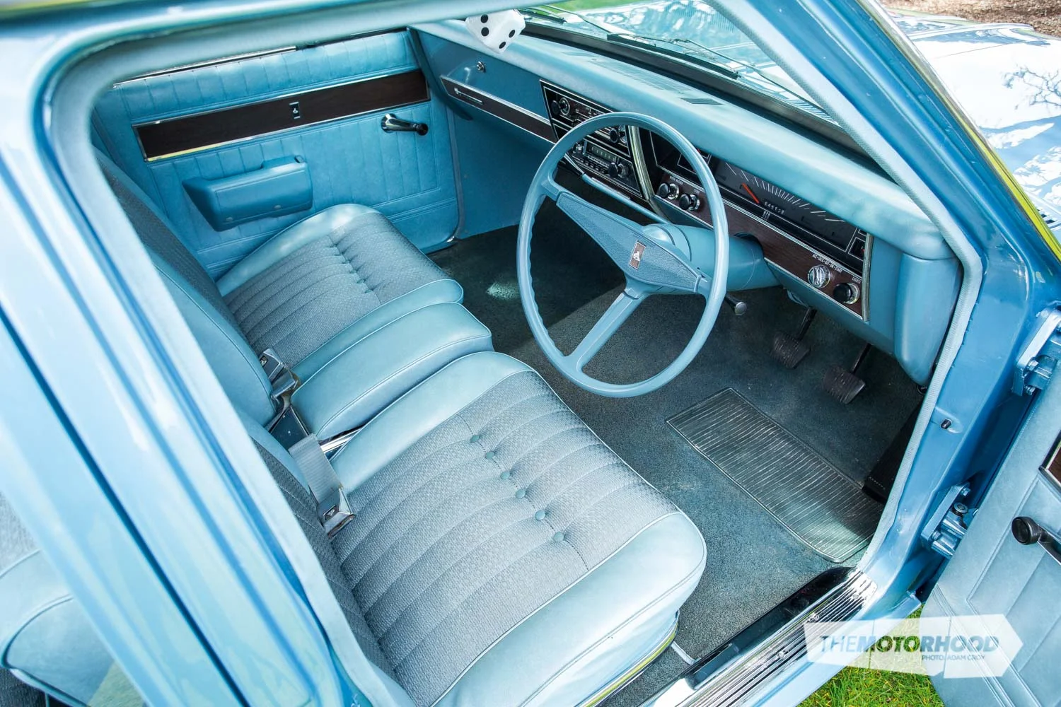 Once the Holden had been returned to Ian’s home garage, he decided to install a more sporty HK GTS dashboard, one that included instrument gauges rather than warning lights — with the ‘new’ speedometer being recalibrated to reflect the wagon’s original 94,000 miles (151,278km). Ian also installed the original seats, panels and carpets, while Brian Thurston attended to any final mechanical work. As a nice period finishing touch, Ian also fitted a set of blinds for the rear side windows, these having been purchased from Australia.