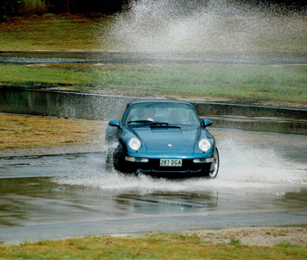 Back at Mt Cotton, we were told a 911 Turbo could accelerate from a standstill to 100kph and then stop in the same time as a Holden Commodore HSV V8 needed just to accelerate to 100kph. We soon learnt Porsches have brilliant brakes on the limit. The emergency braking tests are completed in both manual gearbox and automatic versions of the 911. Autos are better for braking since there are just two pedals and using the left foot for braking means less pedal reaction time.