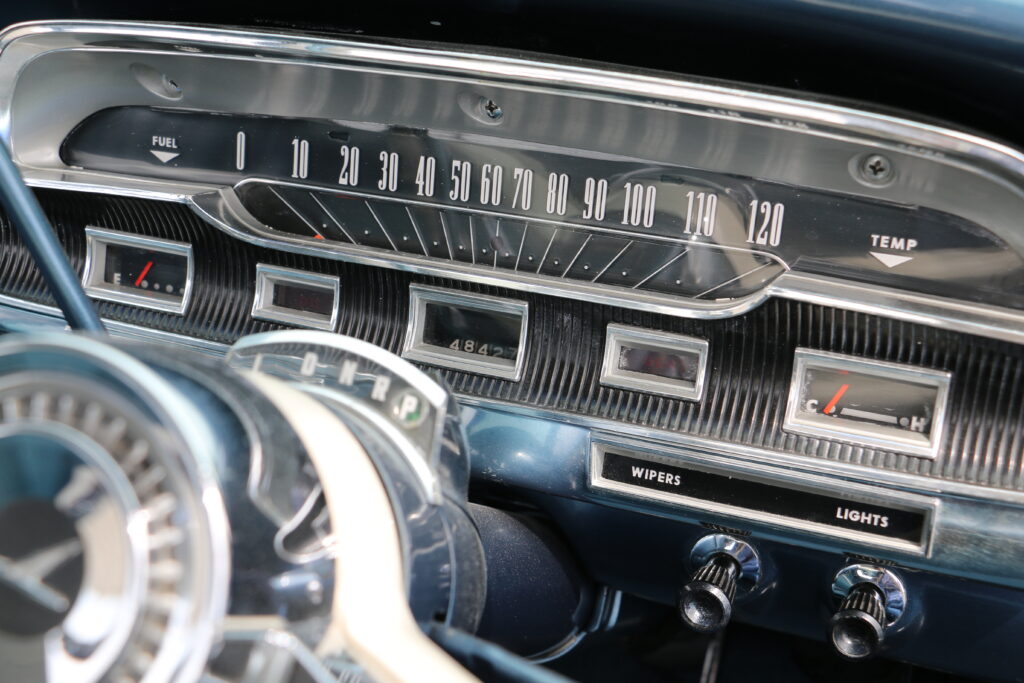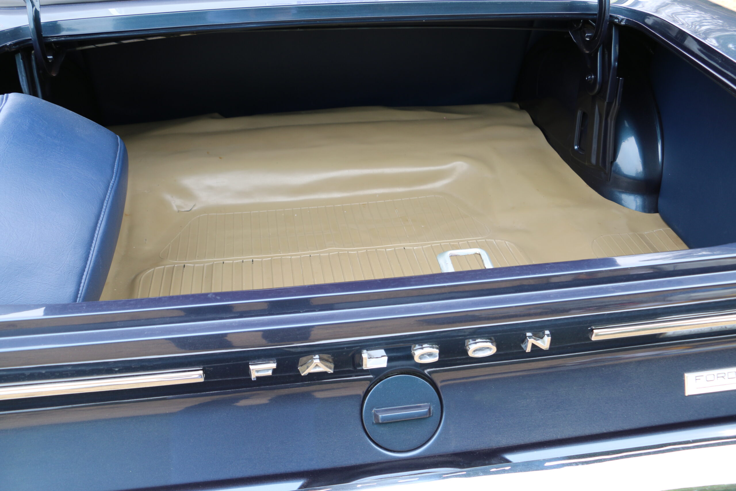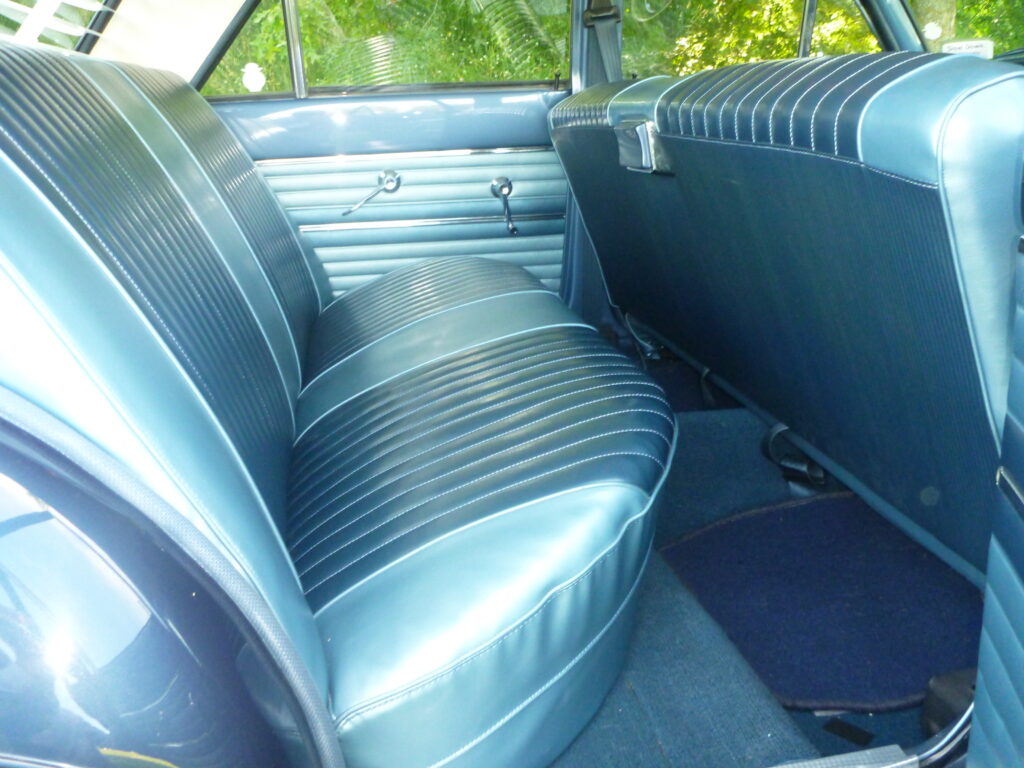 Mileage at time of writing is 48,343. Since it has been back in our ownership, I have just pottered around detailing here and there. The boot area on any vehicle manufactured prior to, say, the past two decades, was never very flash or detailed. The spare wheel, for instance, is mounted vertically on the left hand side of the XP Falcon. It looks very untidy, as such, so I had Andrew Stewart, a retired motor trimmer in Rangiora, make up a mid-blue vinyl cover for it. Yes, I know that takes away the car’s originality, but I don’t mind improving little areas like this. The boot mat is still in remarkably good condition. Not perfect, but that’s the way it will stay. Not black, as one would expect, but in a nice tan colour. Another wee improvement I have made in the boot area is the inside of the rear guards, which is not a tidy sight. I made-up hardwood patterns to cover this area, and the same applied to the back of the back seat. I then had these covered in thin sponge, followed by a layer of the same mid-blue vinyl. In October 2016, I fitted a new set of tyres. They have a narrow whitewall. I would have preferred a wider whitewall, but that was all I could find in 13-inch. The ’65 XP Futura was fitted with 14-inch wheels and disc front brakes.