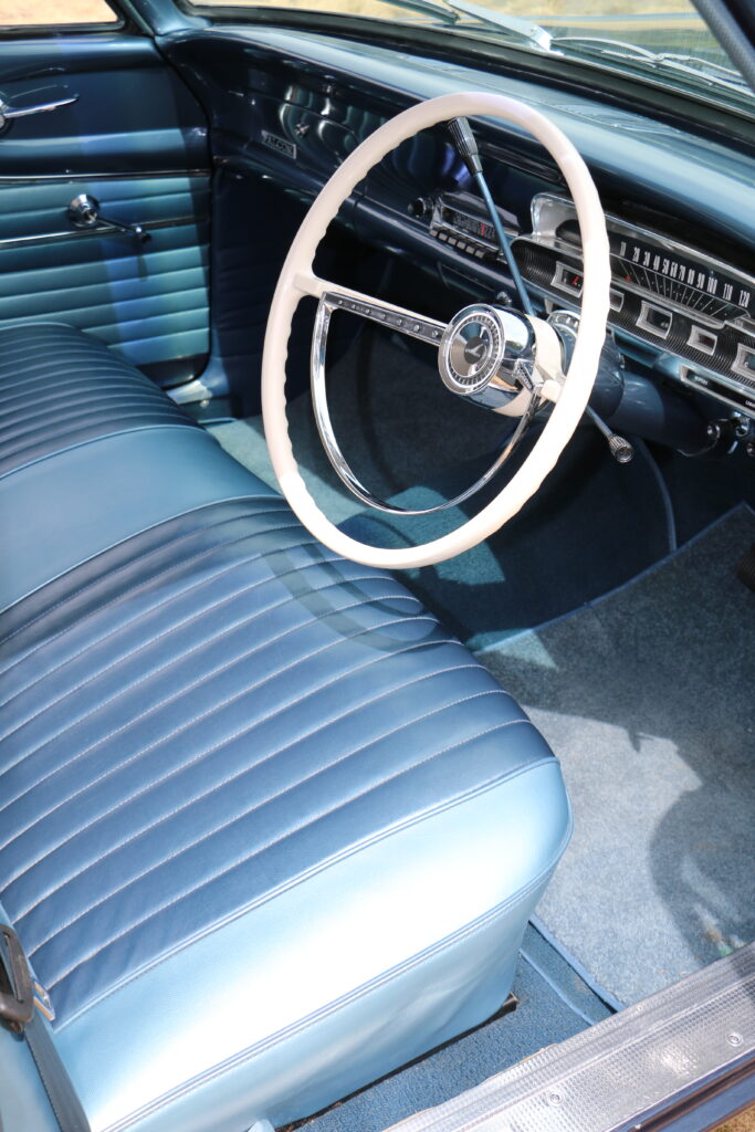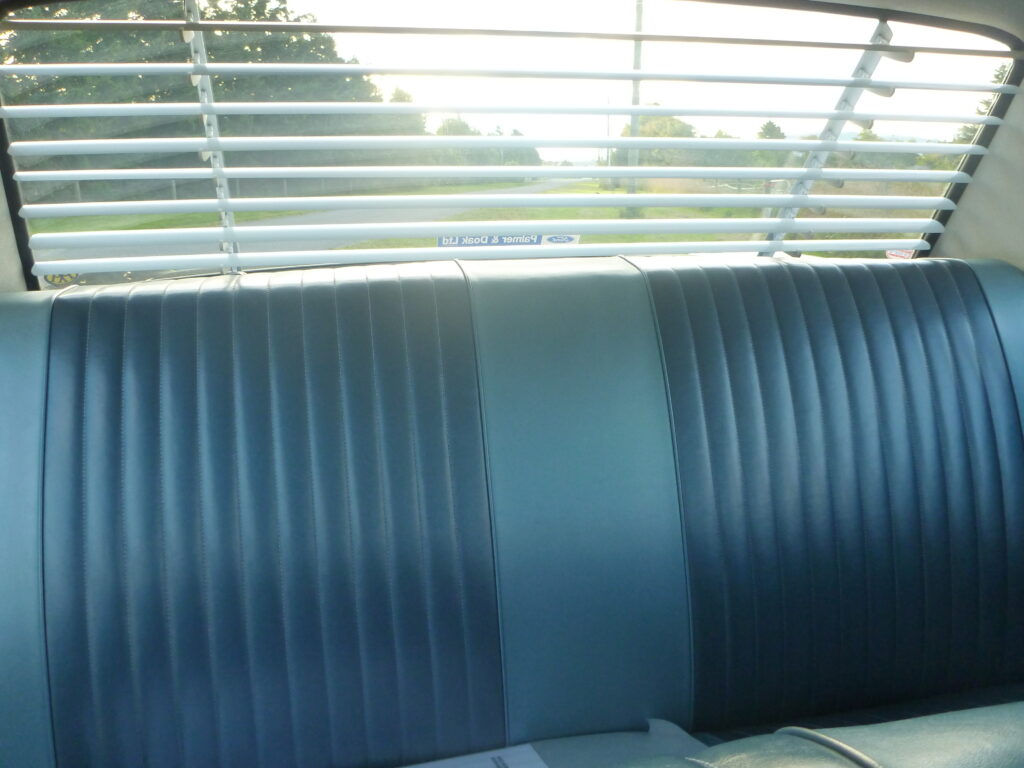 Well, at first glimpse, as soon as the lady opened the garage doors, I knew I was going to buy it. Dark metallic blue with two-tone blue vinyl trim, with a cream American-style steering wheel — I just could not believe my eyes! The Falcon was in as new condition as you could expect from a 30-year-old car. The owner was Mrs Iama Dzenis, aged in her late 60s, at a guess. Mrs Dzenis had bought the car new in September of 1965 from the Ford agents of North Canterbury, Palmer and Doak. Their headquarters were in Rangiora, with branches in Kaiapoi and Amberley.